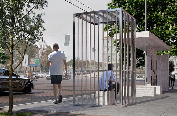 Несущей конструкции остановки из бетона придана форма модульной сетки газеты. На ней — избранная информация по делу Бейлиса, цитаты, фото, прямая речь экспертов и т.п. Некоторые плоскости оставлены пустыми — вспомните ромские погромы 2017 — 2018 годов в Киеве, Одессе, Львове и Тернополе — они тоже могут найти свое место в истории ненависти и предубеждений, и частично отражены на стендах инсталляции.