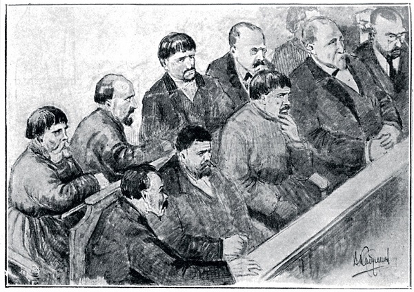 В такой атмосфере готовился суд над приказчиком, и «лучшим людям страны» была отведена в этом фарсе особая роль. Как правило, суд присяжных формировался в основном из дворян, купцов и разночинский интеллигенции, но на этот раз рисковать было нельзя, поэтому обвинение сделало ставку на самые темные слои российского общества. Из 12-ти присяжных пятеро, включая старшину, состояли в «Союзе русского народа», органом которого и являлось погромное «Русское знамя». Несколько крестьян, извозчик, сотрудник почты, мелкий чиновник, служащий вокзала, контролер трамвая, работник винного склада — эти люди не могли ошибиться, поддержав идеологически правильный и освященный свыше вердикт. Но даже они не взяли грех на душу, слишком уж белыми нитками было шито обвинение, слишком очевидной была ложь свидетелей, терпеливо разоблачаемая защитой.