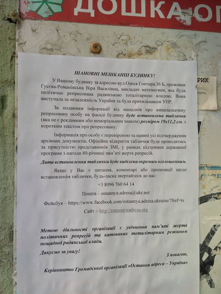 ![]() Объявление об установке таблички на доме репрессированного |