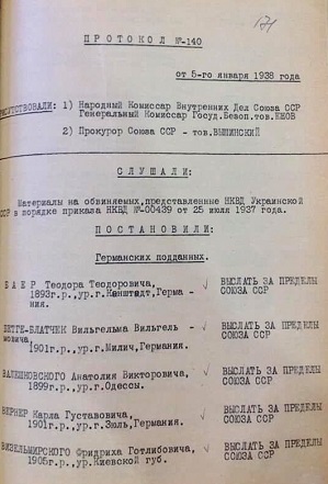 Протокол от 5 января 1938 года подписан наркомом Ежовым и прокурором Вышинским. В нем перечислены имена 45 граждан Германии, Австрии и других стран, приговоренных к высылке из СССР. После того, как Сталин и Гитлер стали союзниками в 1939-м, выдача беженцев нацистам была поставлена на поток. До лета 1941 года НКВД переправило в Германию сотни человек — коммунистов и евреев, спасавшихся от нацизма, Сталин отправлял к Гитлеру.