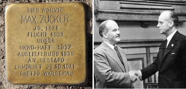 На Дернбургштрассе в Берлине среди других «камней преткновения», напоминающих прохожим о жертвах нацизма, есть латунная табличка, на которой выгравированы несколько дат, — пишет Дмитрий Волчек на сайте Радио Свобода. — Она установлена на месте, где до войны стоял дом бизнесмена Макса Цукера. После прихода Гитлера к власти предприниматель решил эмигрировать из Германии и переехал к сыну, жившему в СССР. Решение оказалось роковым. В 1937 году Макс Цукер был арестован НКВД по обвинению в шпионаже, а в 1939-м, после подписания пакта Молотова — Риббентропа, депортирован в нацистскую Германию. На границе его встречали сотрудники гестапо. Как еврея и уроженца Польши Цукера отправили в варшавское гетто. 23 октября 1941 года на улице его забили до смерти эсэсовцы.