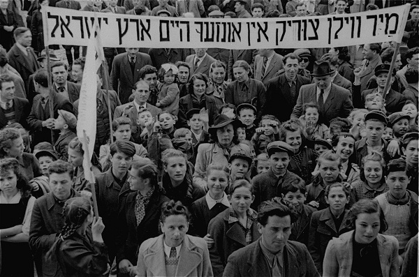 Евреи в лагере для перемещенных лиц под Мюнхеном. На баннере надпись на идише: «Мы хотим вернуться в свой дом, в Землю Израиля», 1945