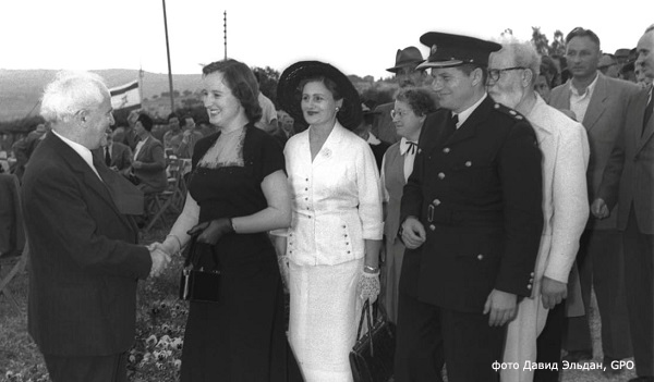 Мери Бен-Гурион (в черном платье) пожимает руку премьер-министру, позади — Амос Бен-Гурион
