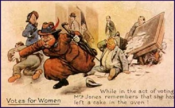 «В процессе голосования миссис Джонс вдруг вспомнила, что забыла пирог в духовке!», антисуфражистская карикатура