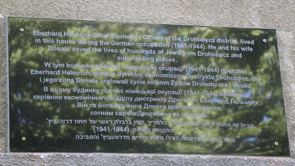 Текст на памятной доске гласит: «В этом доме во время немецкой оккупации (1941 — 1944) жил руководитель экономического отдела дистрикта Дрогобыч Эбергард Гельмрих. Он и его жена Доната спасли жизнь сотням евреев Дрогобыча и окрестностей».