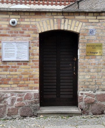 Дверь синагоги Галле со следами от пуль | Цветы у Kiez-Doner в память о погибшем посетителе |