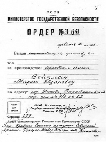 Министр госбезопасности Семен Игнатьев | Ордер на арест Марии Вейцман |