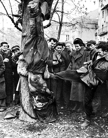 Карикатура на Ракоши, октябрь 1956 Повешенный вниз головой изуродованный труп сотрудника госбезопасности