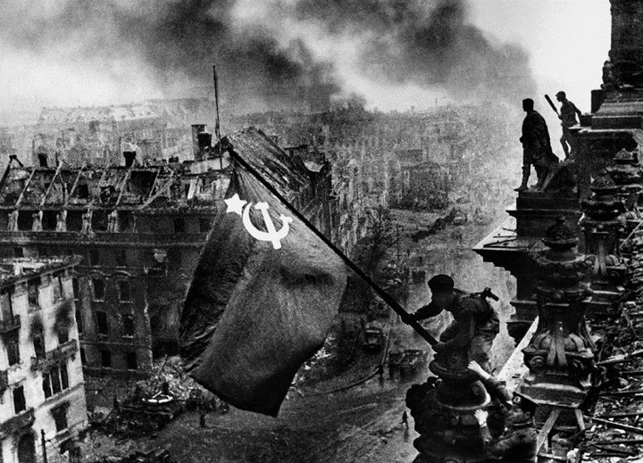 Символами перемоги союзників у Другій світовій війні стали два фото: червоний прапор над напівзруйнованим Рейхстагом у Берліні і група американських солдатів, що встановлюють американський прапор на Іводзімі. Автор першого знімка — уродженець Юзівки Євген Халдей. Під час єврейського погрому 13 березня 1918 року були вбиті його мати (при спробі захистити сина) і дід, а сам однорічний Женя дістав кульове поранення в груди. У 13 років прийшов на завод, тоді ж захопився фотографією і в 16 став фотокором. З 1939 року Халдей — кореспондент «Фотохроніки ТАСС». За чотири роки війни пройшов зі своєю камерою від Мурманська до Берліна. В історію увійшли його кадри з конференції в Потсдамі й підписання акту капітуляції Німеччини. Фотографії Євгена Халдея були представлені в якості речових доказів на Нюрнберзькому процесі.